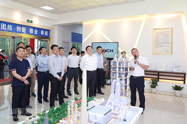 在白馬山水泥廠碳捕集示范項(xiàng)目展廳,包信和一行觀看了項(xiàng)目介紹資料片和工藝模型,聽取了白馬山水泥廠廠長金峰有關(guān)項(xiàng)目工藝流程、技術(shù)原理和運(yùn)行情況介紹,并詳細(xì)詢問了捕集規(guī)模、產(chǎn)品純度、收集轉(zhuǎn)化利用率以及市場和效益情況。